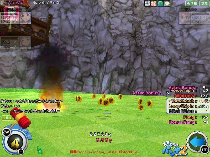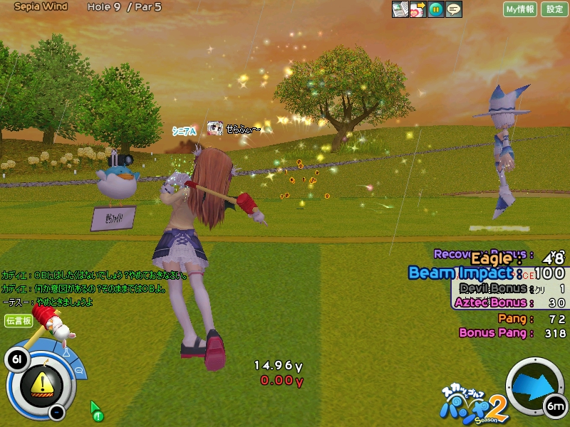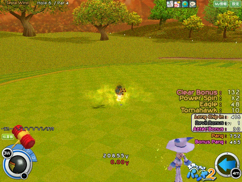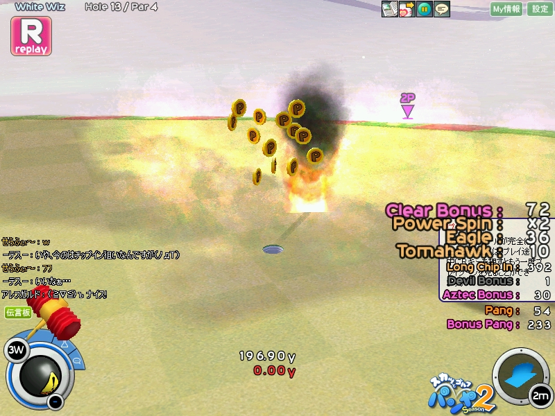 そのすぐあとのホールでのチップインEG、風は私の大ッ嫌いな横風でしたね。横風はどうしても私のやり方だと誤差がでるんですよねー(хх。) もっと練習して誤差をなおさなくっちゃ。それにしてもPPウマー(゜Д゜) まぁどうせクロポンに全部吸い上げられてしまうんでしょうけどねorz