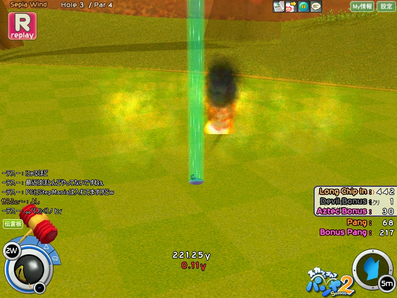 はい、チップインEGの図です。・・・やっぱりチップだけはでるのね(ノ_<。)うっうっうっ 風は私の大好きな斜めぎみの風でした、ほんとはチップでも喜ばしいことだけど、ここまでHIOでないと素で凹みます。_| ̄|○