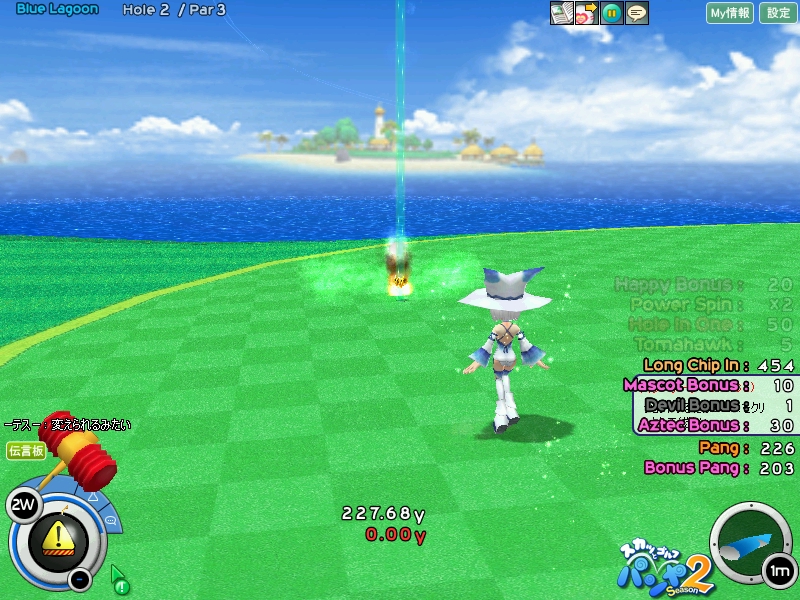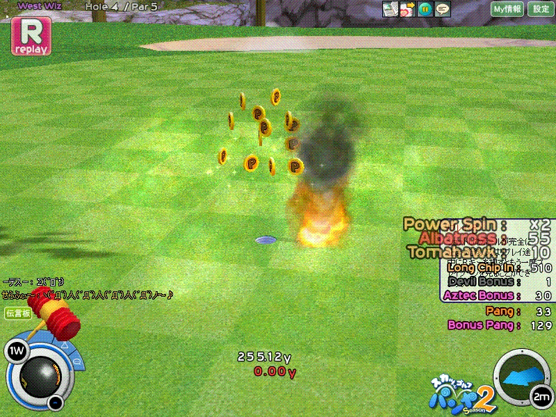 あまり詳しくない方はここで補足説明を、まずグリーンから意図的に外に出し、そこから6Iや9Iを使ってグリーンにバウンドさせずにピンを直接狙うショットです。ビームに当たると急降下する力を利用しているのですね。これだけでBIボーナス100PPが貰えるというお得なショットになっています。
